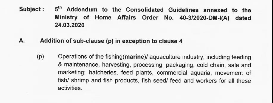 据印度内政部4月9日发布最新通知(下图),海洋捕捞、水产养殖、饲料生产、种苗生产、加工、冷链及市场营销相关活动不再受“封锁令”的约束。