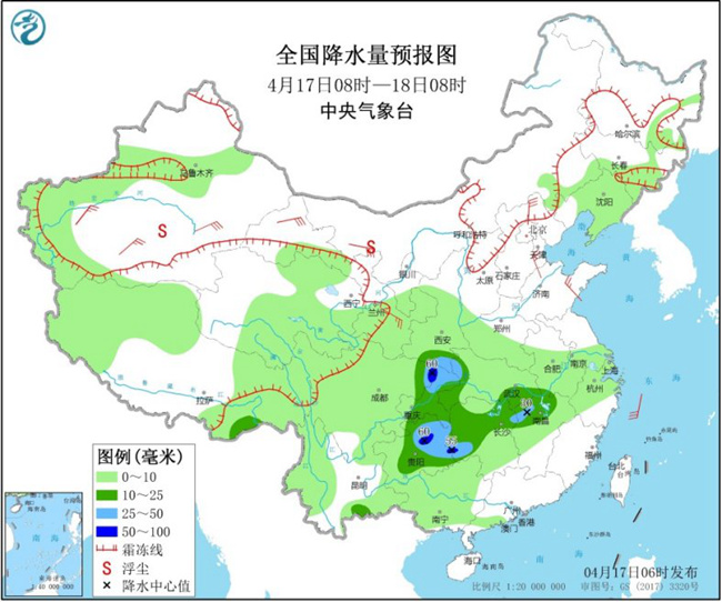 4月18日08时至19日08时,陕西东南部、西藏东南部、西南地区东部、江淮大部、江汉南部、江南北部和西部、广西北部等地部分地区有中到大雨,其中,湖南东北部、江西北部、安徽南部、广西东北部等地局地有暴雨(50~65毫米)。
