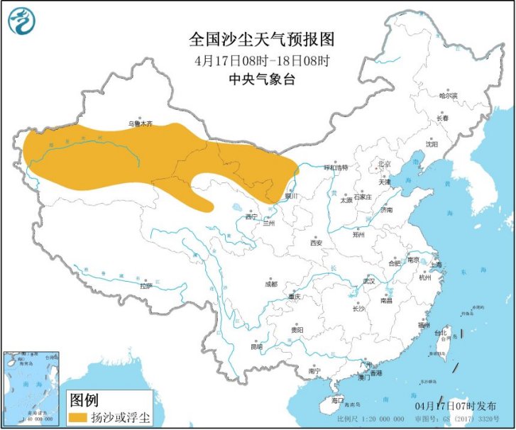 沙尘方面,预计17日白天,内蒙古西部、新疆南疆盆地、甘肃河西及河北南部、山东中西部等地部分地区仍有扬沙或浮尘天气。(出处:中央气象台)
