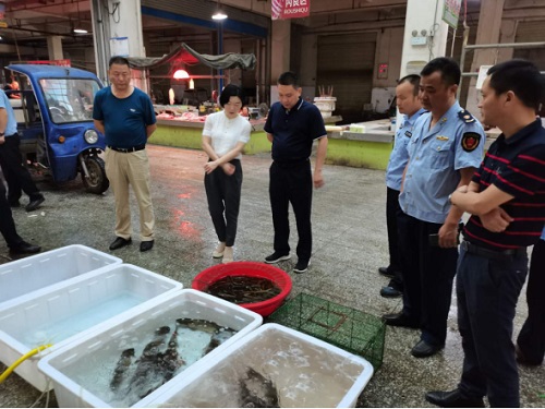 7月28日早上6点,由湖南省益阳市大通湖区副区长吴灿、秦琴带队,区市场监管局联合区公安分局、区农林水务局、区自然资源局等部门深入河坝镇银河市场、金泰市场,对水产品销售情况进行突击检查。检查过程中,吴灿、秦琴仔细向经营户询问水产品的进货时间及来源,查看经营户的进货票据、资质,核对身份信息,宣讲相关政策规定,指导经营户完善进货制度,要求市监部门进行登记,进行后续的跟进调查。